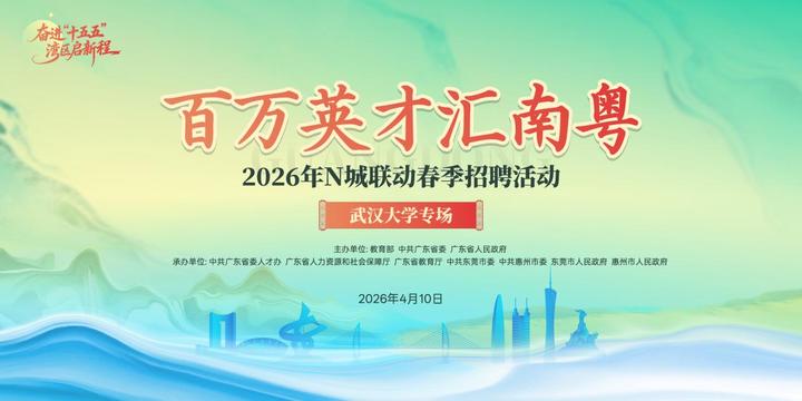 4月9日至10日,由教育部,广东省委、省政府主办,东莞市、惠州市联合对接的“百万英才汇南粤”2026年N城联动春季招聘活动将在武汉正式启动。“广东号”引才专列将依次驶入华中科技大学、中国地质大学(武汉)、武汉大学、武汉理工大学四所重点高校,为荆楚学子带来一场规模空前的跨区域人才奔赴。据悉,东莞市将组织超300家次企事业单位赴武汉现场“揽才”。