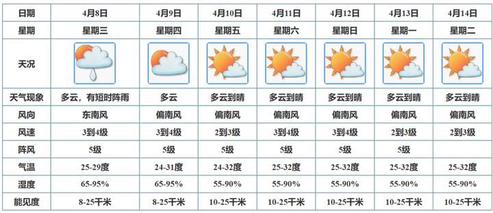 据@江门天气 预计,8日至9日多云天气为主,间中有短时阵雨;10日至14日天气维持多云到晴,午间炎热。