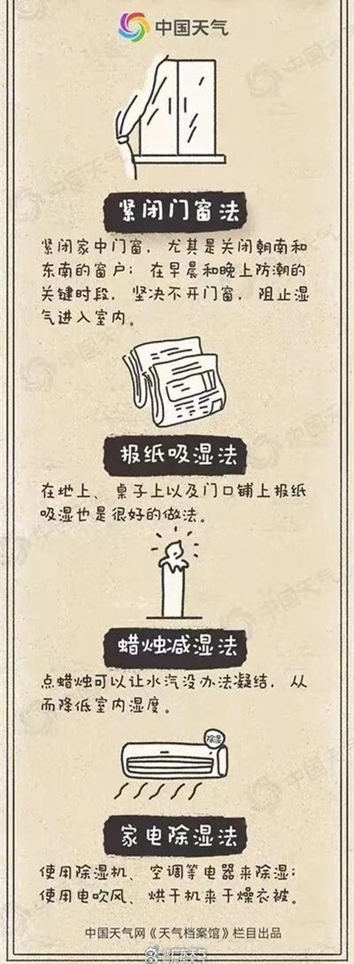 据@广东天气 近期广东雨雾频繁 空气湿度偏高 天气又热又湿 防潮不能大意! 外出及夜间记得关好门窗 减少湿气进入 若柜体板面出现凝水 要及时擦干 并开启空调除湿或制冷模式抽湿 保持室内干爽