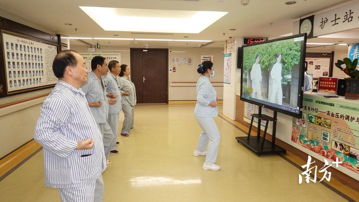 医护人员组织病区内患者做八段锦,辅助康复。