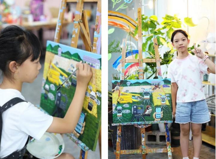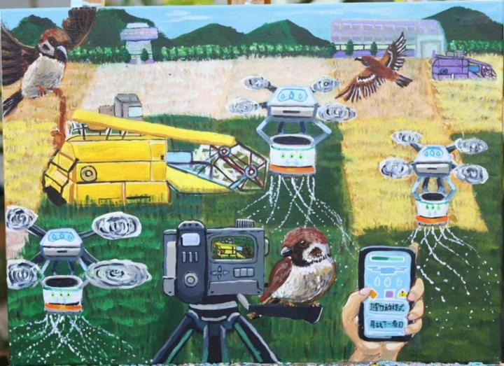 谈及创作灵感,王梓忻同学表示,爷爷奶奶在田间辛勤劳作的身影,一直印在她心里。那些画面,让她想起学校科学课堂上讲到的智慧农业、无人机、传感器、自动灌溉。