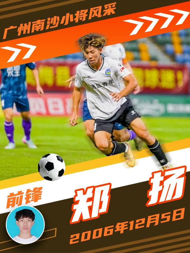 郑扬来自广州市南沙区南沙街道东瓜宇村,目前效力于广州南沙中交四航图南,就读于广州华商学院。他对抗和耐力强,防守硬朗,视野开阔,善于传渗透球和转移,脚下技术扎实且速度较快。曾代表广州华南师范附中番禺学校、佛山南狮梯队、广州南沙南英湾区青年等队参赛,获得首届南沙区男子足球甲级联赛最佳新人奖及2024年南沙区男子足球甲级联赛最佳射手奖。去年刚参加完高考,他便在广东省足球超级联赛中代表广州南沙湾区青年队登场。