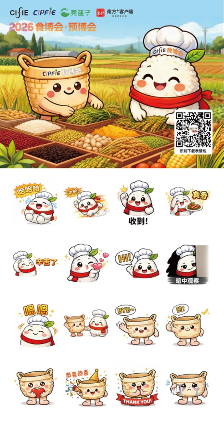 一只头戴厨师帽、身着红围巾,如同饱满圆润的稻米;一只身体圆润,竹篾纹理隐约可见,恰似一个等待盛满美味的菜篮子……近日,第十届中国国际食品及配料博览会(下称“食博会”)吉祥物“莞宝”“菜宝”系列表情包萌趣上线,结合日常问候、趣味互动等生活场景,设计了16款萌态十足的表情,承包用户的日常聊天氛围感。