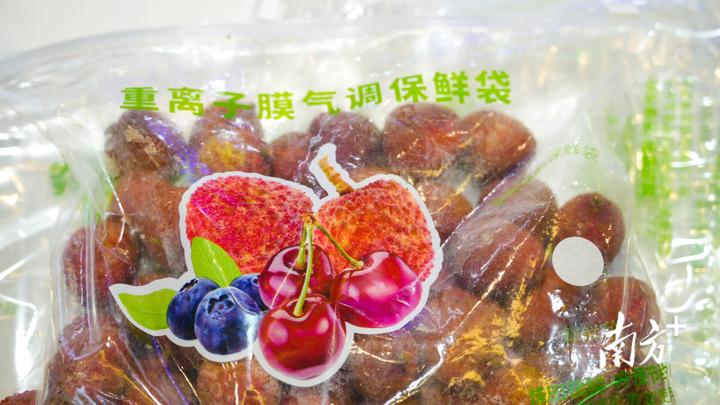 工作人员展示,一周前装入保鲜袋的荔枝,无需冰块降温,依旧果肉饱满、无变质异味,解决了荔枝快递“冰重、包装体积大成本高、保鲜周期短”的痛点。