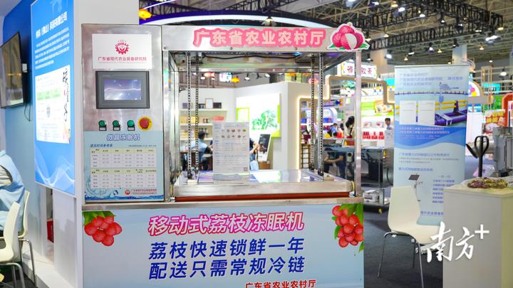 在第十五届广东现代农业博览会主展区,一台银灰色移动式荔枝冻眠机前人头攒动。工作人员拆开一袋密封包装,去年7月锁鲜的仙进奉荔枝果皮依旧红艳饱满,剥开后果肉晶莹、汁水充沛,现场观众、参展企业纷纷驻足品尝、咨询。