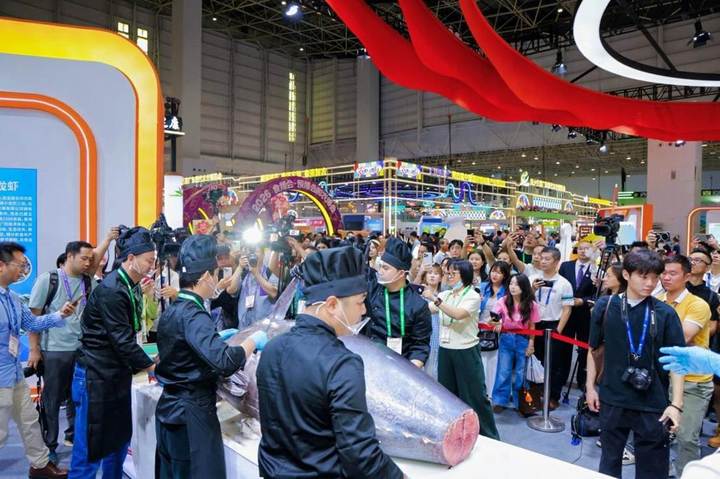 恰逢食博会十周年,展会专门打造了吉祥物“莞宝”“菜宝”IP形象,萌动全场,成为展会的“打卡点”之一。而在联成远洋渔业集团的展位前,一场震撼的“开鱼秀”吸引了大量观众驻足围观。一条重达500公斤的巨型金枪鱼被工作人员精准分割,新鲜的鱼肉纹理清晰可见,让食客们直观地感受到了“看得见的新鲜”。同时,“食”光隧道沉浸式展区回顾了食博会十年发展历程,也让观众感受到了东莞农食产业的成长与进步。