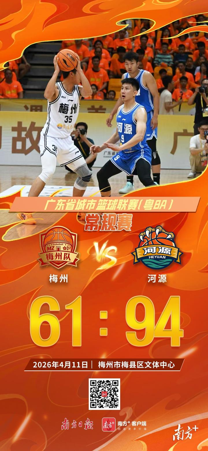 4月11日晚,2026年广东省城市篮球联赛(粤BA)常规赛第三轮的焦点战役——“客家德比”在梅县区文体中心打响。面对坐镇主场的梅州队,上赛季总冠军河源队展现出深厚的竞技底蕴,最终以94:61的比分大胜对手,拿下常规赛关键胜利。