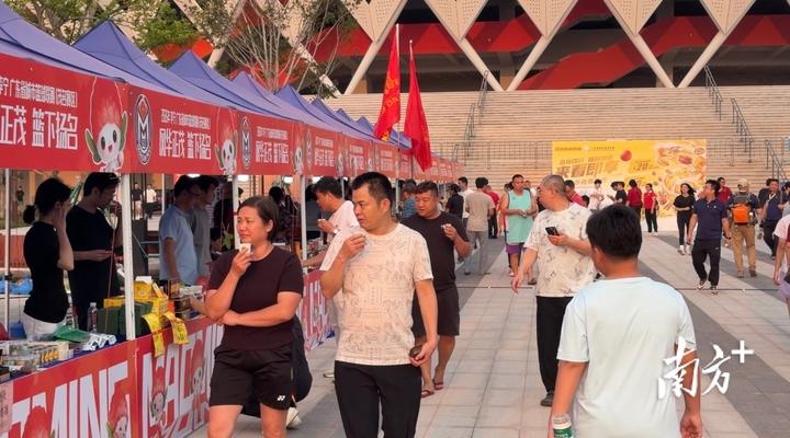 场馆外,茂名同步举办“广货行天下”茂名好货市集,汇集化橘红、沉香、荔枝雪糕等“信字号”产品和文创精品。球迷凭赛事票根可享专属折扣,部分商品低至七折或买一送一。“捞粉、罗非鱼,好多茂名特色美食都吃了。”一名球迷打趣,“比赛还没开始,已经饱了。”