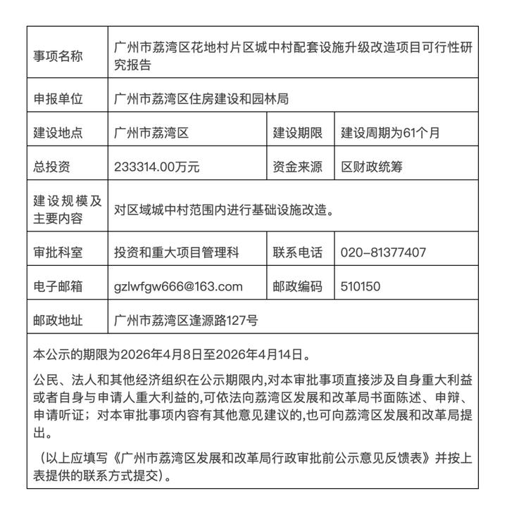 随后于4月9日,荔湾发布花地街道中市社区、民治社区两个社区微改造项目历史文化遗产调查评估工作编制服务询比公告。