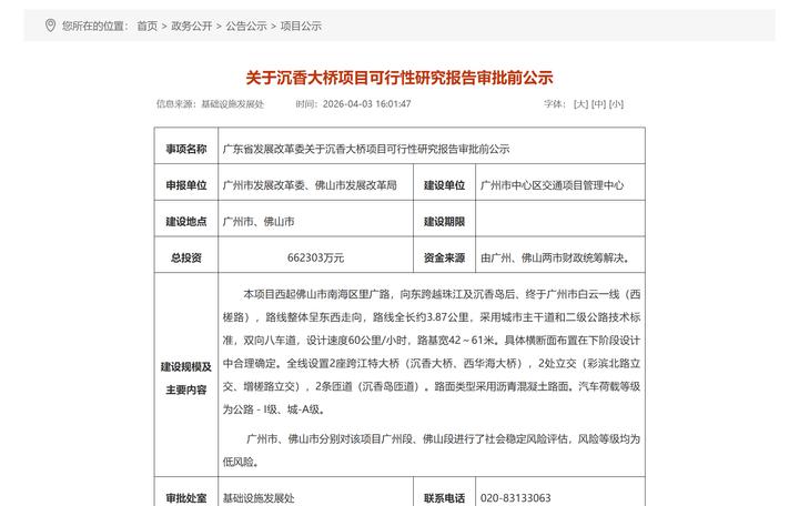 近日,备受广佛市民关注、已规划十九年的沉香大桥传出新动态。根据广东省发展改革委官网发布的《关于沉香大桥项目可行性研究报告审批前公示》(以下简称《公示》),沉香大桥项目总投资超66亿元,由广州、佛山两市财政统筹解决。广州市、佛山市分别对该项目广州段、佛山段进行了社会稳定风险评估,风险等级均为低风险。
