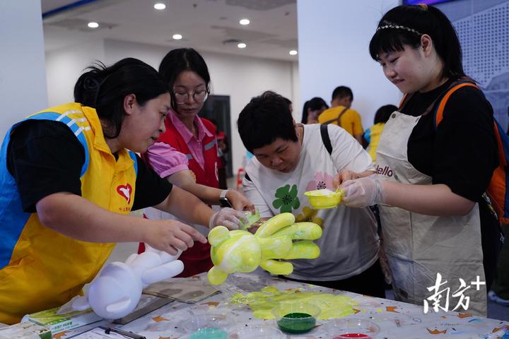展厅入口处,“与星相伴,与爱同行”公益服务体验活动同步开展。市民与“星孩”结对,在专业老师指导下共同完成流体画创作。颜料缓缓倾倒,色彩自由流淌,“他选的颜色很大胆,我觉得比我自己做的还要好看。”一位市民看着身边的星孩,眼里满是欣赏。