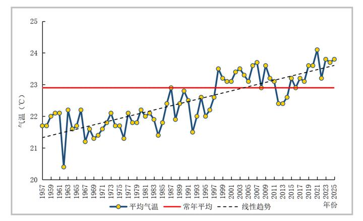 2025年,佛山南海全年平均气温为23.8℃,较常年(22.9℃)偏高0.9℃,位列有气象记录以来历史第二高。全年高温日数(日最高气温≥35℃)达到46天,较常年(29.4天)偏多16.6天,增幅接近六成。
