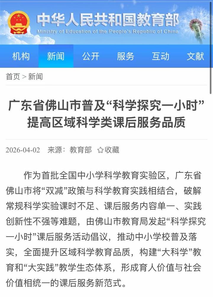作为全国首批中小学科学教育实验区,佛山自2023年在全省率先倡导“科学探究一小时”活动以来,不到三年时间便交出了亮眼答卷。相关案例获得教育部2025年中小学科学教育优秀案例并在全国推广。