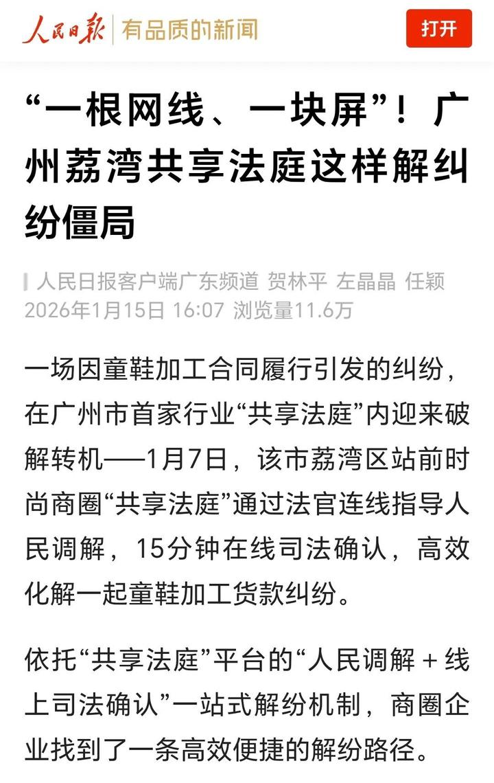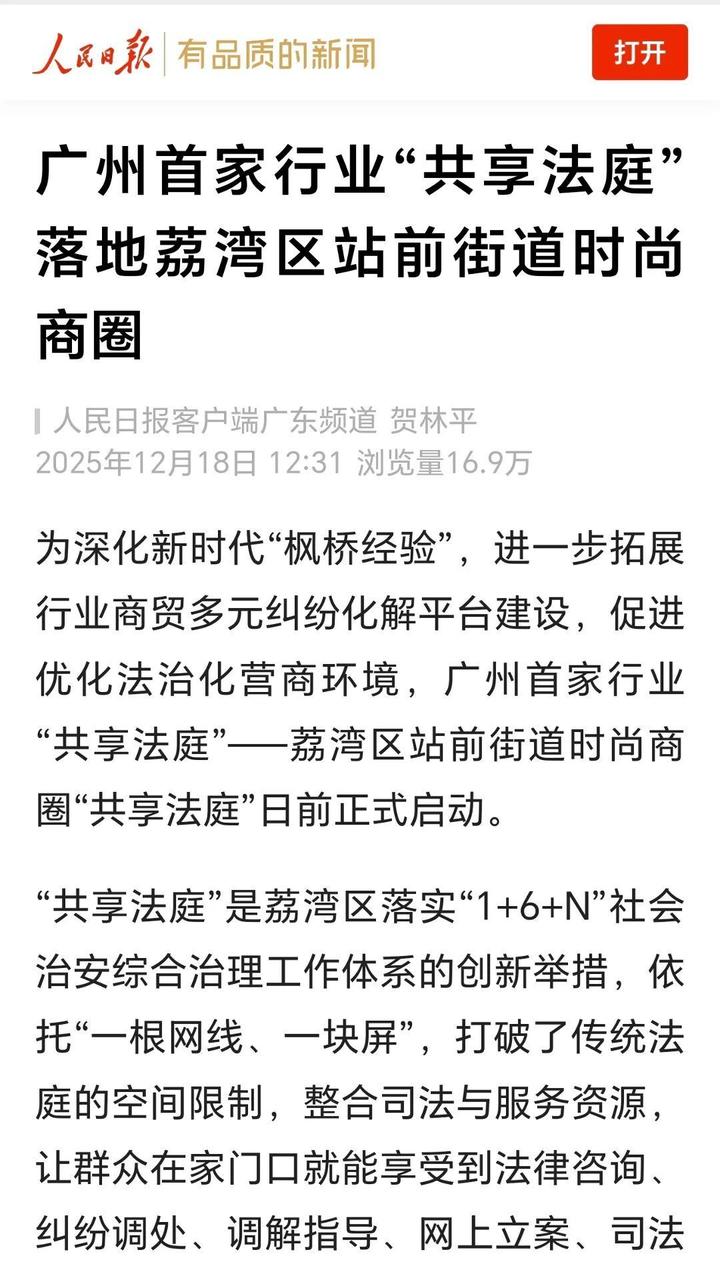 突破司法服务时空限制,率先落地广州首家行业商圈“共享法庭”,开通“人民调解+线上司法确认”一站式解纷通道,有效降低企业解纷成本,提升司法服务可及性,相关做法获《人民日报》等央媒报道。