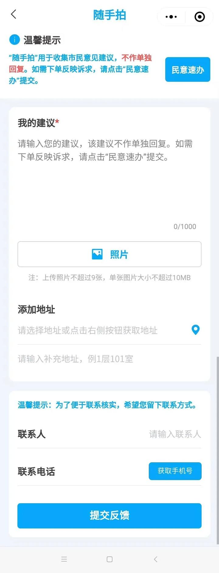 3.填写建议内容,上传照片,添加地址并留下联系人、联系电话(方便我们必要时核实),最后点击“提交反馈”即可。