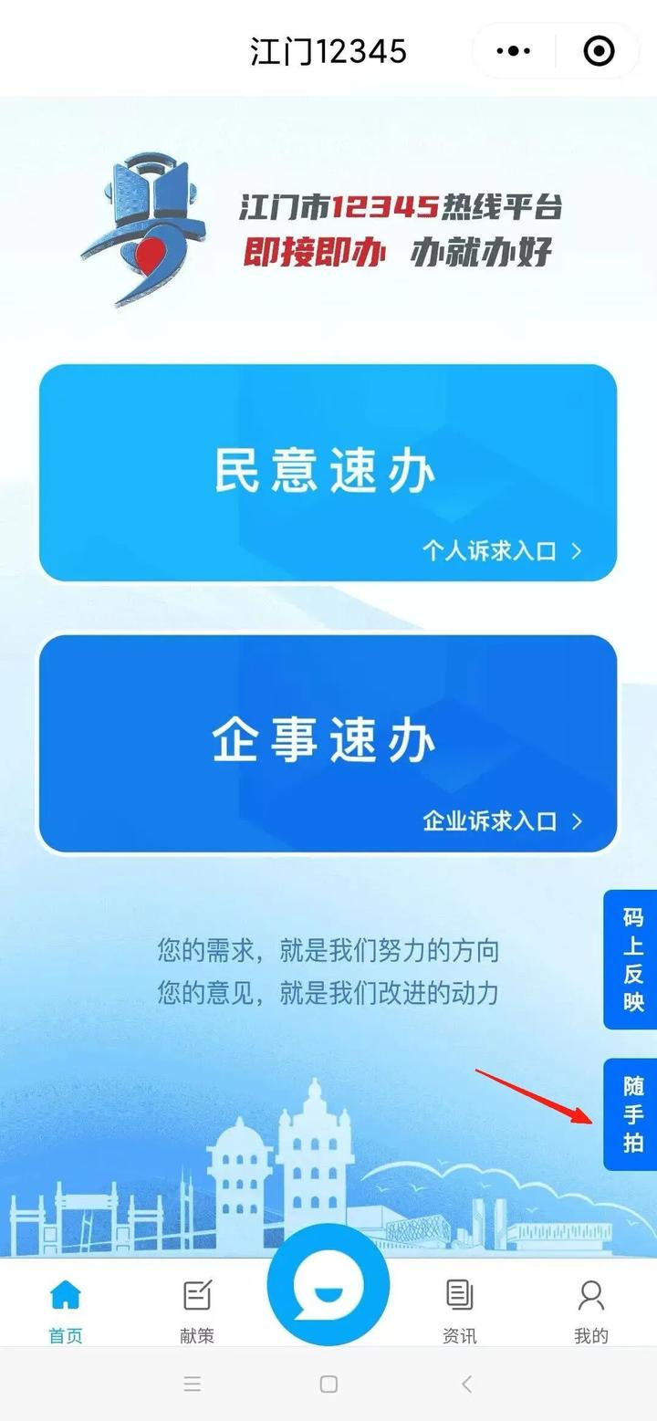 1.微信搜索“江门12345”小程序,进入首页;