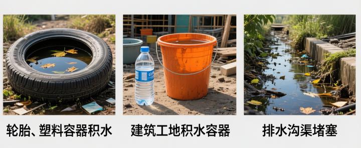 小区、楼道、公园、绿地等公共区域存在长期积水(废弃花盆、轮胎、塑料容器、地面坑洼积水等)