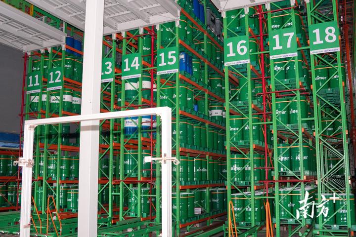 走进广东安美科技股份有限公司(下称“安美”)东部工业园厂区,24米高的智能立体库正在有序运转——十五层、9000多个标准托盘在自动化系统调度下精准存取,每一桶油液化学品都带着独一无二的条形码,从生产到出库全程可追溯。连廊导轨将生产大楼与立体库无缝连通,物料在密闭通道中流转,确保先进先出、快进快出。