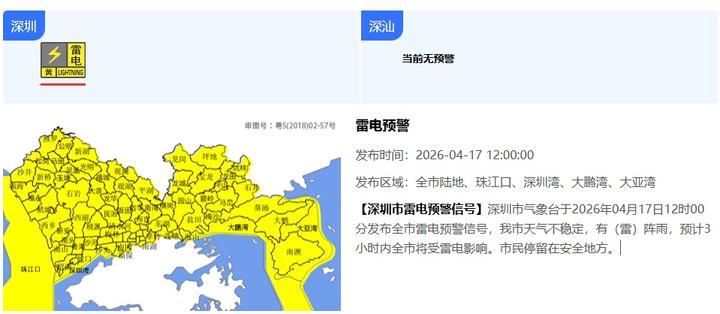 【深圳市雷电预警信号】深圳市气象台于2026年04月17日12时00分发布全市雷电预警信号,我市天气不稳定,有(雷)阵雨,预计3小时内全市将受雷电影响。市民停留在安全地方。