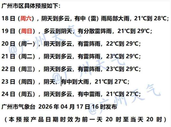 广州市气象台4月17日预计,18日至19日广州雷雨减弱,但仍有分散雷阵雨。预计20日至22日,受南风辐合影响,广州雷雨有所增多。按现有气象资料预计,23日至24日,受高空槽和弱冷空气影响,广州有一次明显强降水伴强对流天气过程。