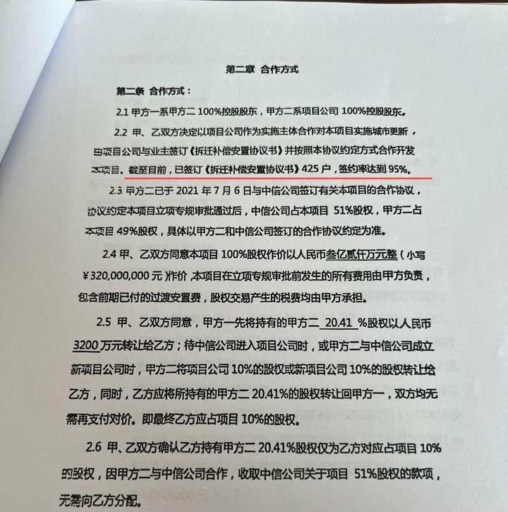 根据黄先生提供的《合作协议书》,黄先生需投资3200万元,通过持有深圳市伍洲置地有限公司约20%的股份,间接投资桃花园旧改项目,占该旧改项目10%的权益。协议中白纸黑字地写明:“截至目前,已签订《拆迁补偿安置协议书》425户,签约率达到95%。”