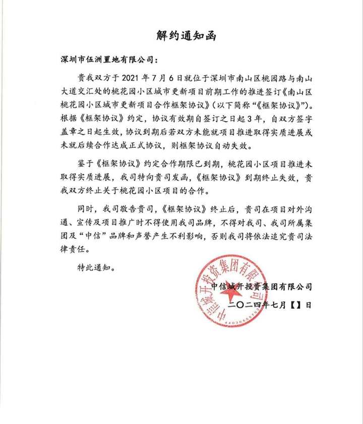当日下午,记者致电中信城开公司核实桃花园小区旧改情况,对方表示并不掌握。但根据一份2024年中信城开投资集团有限公司发给深圳市伍洲置地有限公司的解约通知函,函件中称“鉴于《框架协议》约定合作期限已到期,桃花园小区项目推进未取得实质进展,我司特向贵司发函,《框架协议》到期终止失效,贵我双方终止关于桃花园小区项目的合作”。