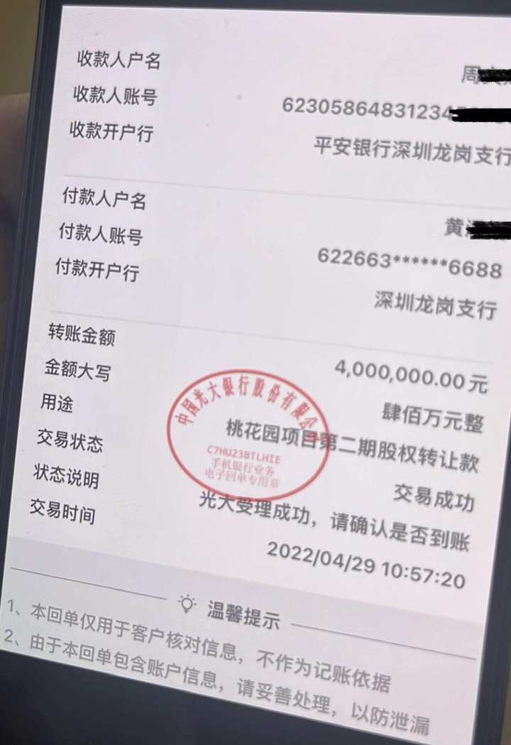 黄先生说,2600多万元直接转入周某个人名下,双方完成了股权变更手续。如今,黄先生依旧是深圳市伍洲置地有限公司的股东,占股20.41%。