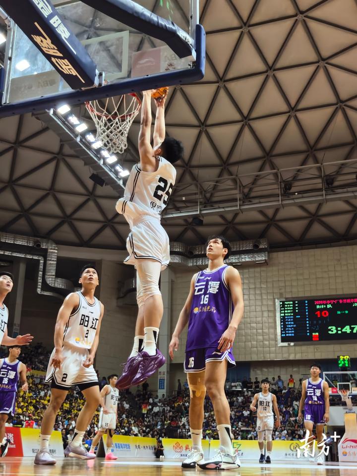 下半场易边再战,阳江队继续提升防守硬度,多次让云浮队进攻无果。随后,云浮队依托高中锋刘朔任的支点作用,抓住阳江队的联防漏洞,将比分扳成46平。此后场上比分交替领先,阳江队25号倪家宝的一记篮下暴扣,点燃了全场球迷的热情!第三节战罢,阳江队以58:55领先。