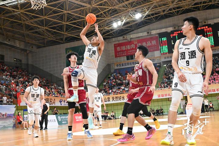 4月18日,2026年广东省城市篮球联赛(粤BA)战火再燃,河源队主场迎战汕尾队。赛事现场,“将身体抛向空中”的篮球少女罗可馨视频打Call。一句“粤BA,我为河源队加油”点燃全场观众的热情。