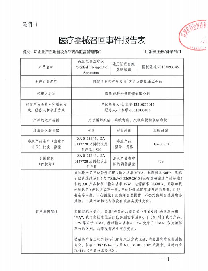近日,广东省药品监督管理局发布消息,深圳市科治好连锁有限公司(简称“科治好连锁”)代理的进口医疗器械“高压电位治疗仪”(注册证号:国械注进20153093345)主动发起召回,召回级别为三级。