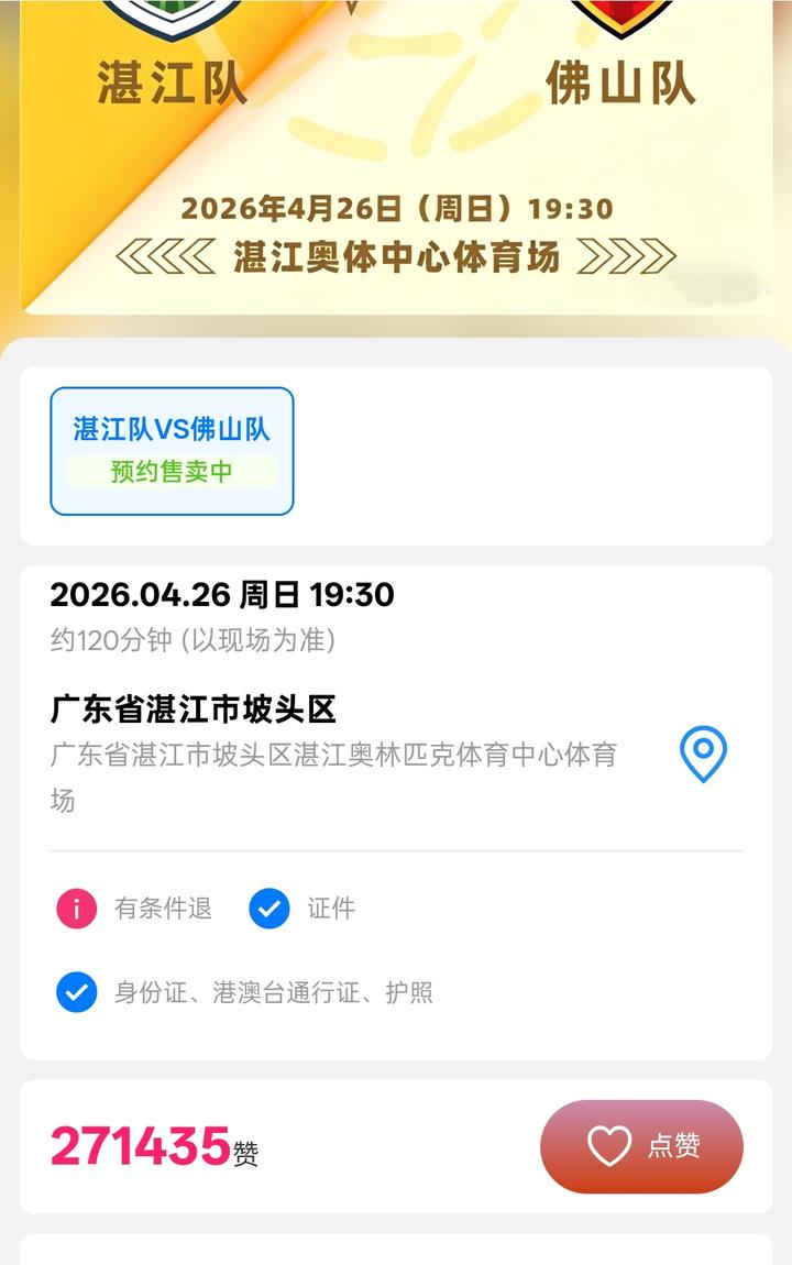 2026年广东省城市足球超级联赛(粤超)即将火热开赛,佛山队首战未赛先火!根据粤超官方购票小程序最新数据,截至4月20日20时,佛山队客场对阵湛江队的揭幕战“想看”点赞量突破27万,高居粤超首轮10场赛事第一位,远超第二名、第三名,成为本届粤超最受关注的焦点对决。