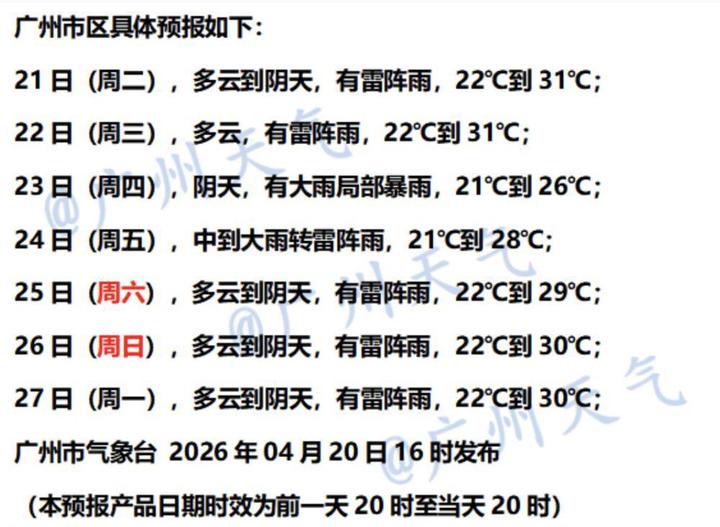广州市气象台4月20日预计,21日至22日受低层南风影响,广州有雷阵雨。23日至24日受冷空气、切变线和高空槽影响,广州有一次大雨局部暴雨并伴强对流过程。预计25日至27日,广州多云到阴天有雷阵雨。