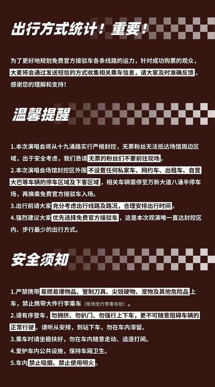 为最大限度保障观众安全、顺畅往返,本次演唱会为所有成功购票的观众提供免费官方接驳车服务,该接驳线路是进入封控区内部且步行距离最短的唯一交通方式,强烈建议观众优先选择乘坐。目前,大麦网已陆续通过短信形式向已购票观众收集出行相关信息,以便主办方合理规划各条接驳线路的运力配置,请收到短信的观众务必注意查收并及时、准确地填写个人出行计划。同时提醒广大观众,出行前应充分考虑实际线路状况与道路交通流量,合理安排出发时间,避免因路况拥堵影响观演体验。