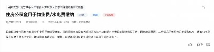 该网友指出,目前部分省市已允许住房公积金用于物业费缴纳,建议深圳市跟进这一举措,以便市民有更多现金流可以用于促进消费。