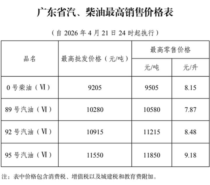4月21日24时起,广东省成品油最高销售价格,0号柴油最高零售价8.15元/升,89号汽油最高零售价7.87元/升,92号汽油最高零售价8.48元/升,95号汽油最高零售价9.18元/升。