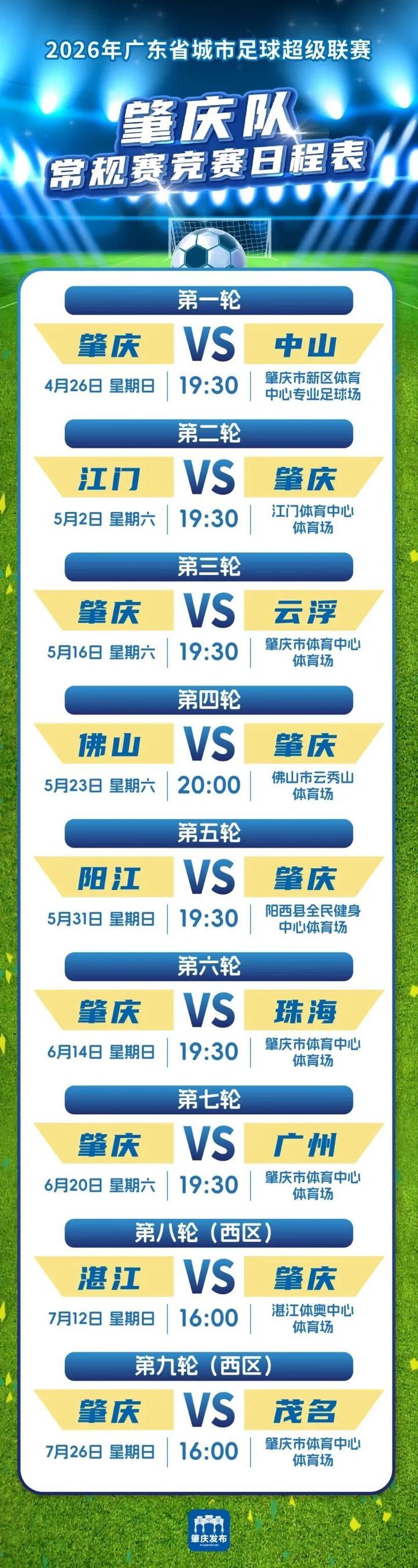 最后划重点!粤超首轮4月25日-26日在全省10个城市同步开赛,肇庆队第一轮将对阵中山,想看球的朋友,既可以购票到现场观赛,也可以选择线上观看直播,让我们一起为广宁球员加油,为肇庆队打call!