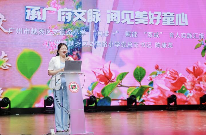文德路小学陈康英书记介绍了广州市越秀区文德路小学以“阅读+”赋能“双减”的育人实践。学校依托广府文脉,打造无边界阅读空间,构建八位一体的阅读体系,将阅读融入课堂、活动、家庭与社区。通过书香校园、红色研读、项目式学习等举措,实现减负增效、润心铸魂,形成鲜明办学品牌,助力教育强国与全民阅读目标。