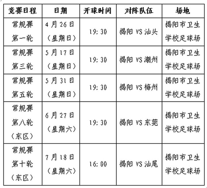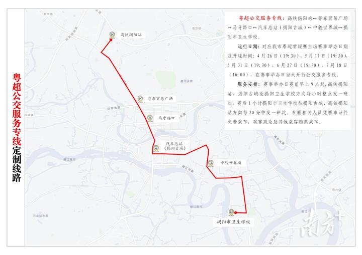 公交专线运行时间对应揭阳赛区粤超常规赛主场赛事举办日期及开球时间:4月26日(19:30),5月17日(19:30),5月31日(19:30),6月27日(19:30),7月18日(16:00),在赛事举办日当天开行公交服务专线。