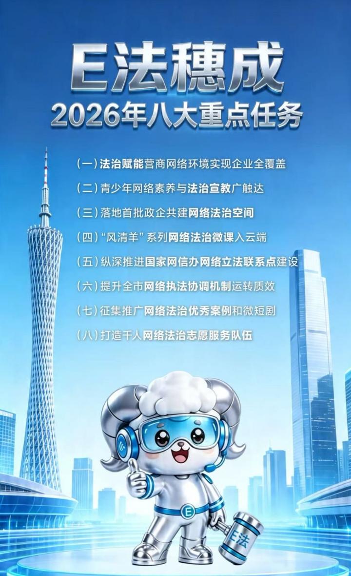 活动现场正式发布“E法穗成×清朗广州”2026全年八大行动,开启广州市年度网络法治建设和生态治理系列工作。行动围绕优化营商环境和未成年人网络保护两大主线,以六项专场活动贯穿全年,涵盖开展法治赋能营商网络环境行动、打造首批政企共建网络法治空间、征集推广网络法治优秀案例与微短剧等重点内容,构建特色鲜明的法治活动网络。