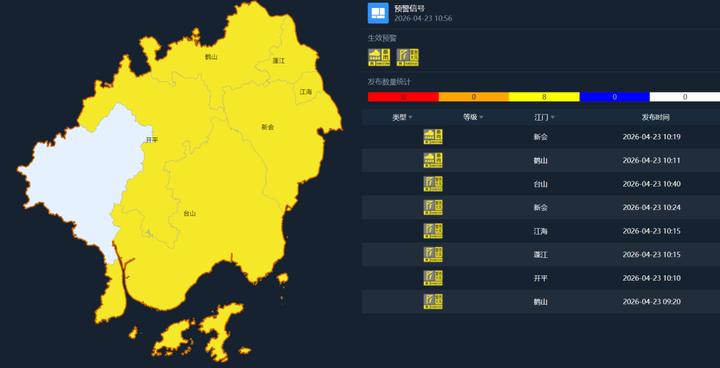 江门多地发布黄色预警!雷雨大风袭来。中央气象台4月23日8时继续发布暴雨蓝色预警:预计今天(23日),广西东南部、广东南部、福建东南部等地部分地区有大到暴雨,其中,广东西南部等地部分地区有大暴雨(100~130毫米)。市气象台预计,江门未来一周雷雨活跃, 24日有中到大雨,局部暴雨。目前处于强对流多