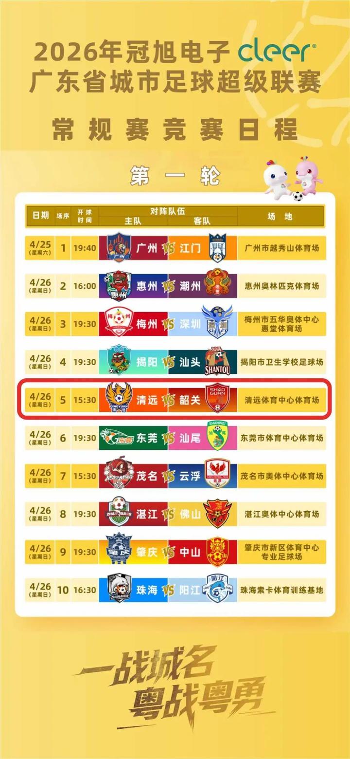 2026年广东省城市足球超级联赛(粤超)备受瞩目的“粤北德比”将于4月26日15:30,正式打响!韶关队远赴清远体育中心体育场,客场对阵清远队,开启本赛季常规赛首秀。同饮北江水、共枕南岭脉的粤北双雄,以足球为媒、以竞技会友,为全省球迷献上一场热血与情怀兼具的绿茵盛宴。