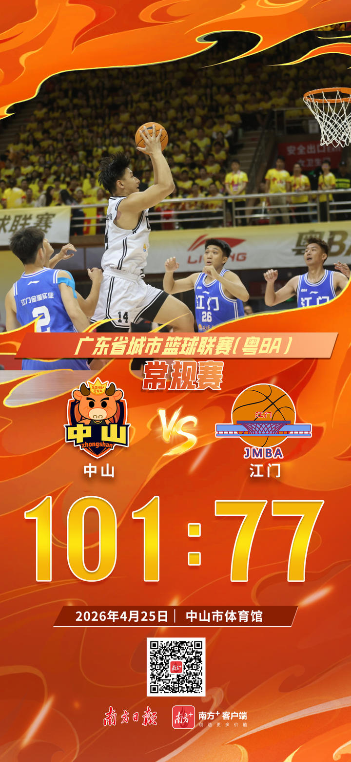 4月25日,2026 年广东省城市篮球联赛(下称“粤BA”)第五轮比赛开启,中山队主场迎战江门队。经过角逐,中山队最终以101:77战胜江门队,取得新赛季开赛以来的五连胜,保持不败战绩。值得关注的是,中山队是目前粤BA西区球队中唯一未尝败绩的球队,高居西区榜首。