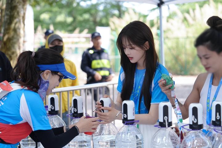 仪式完成后,壹基金净水计划爱心大使杨超越来到1号打卡点,为队员们补水、加油打气,和队员们一起支持净水计划,帮助更多孩子喝上干净的水。