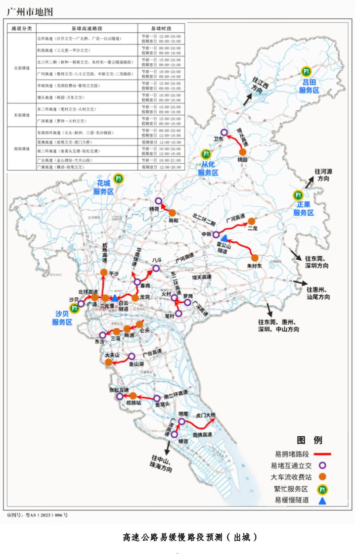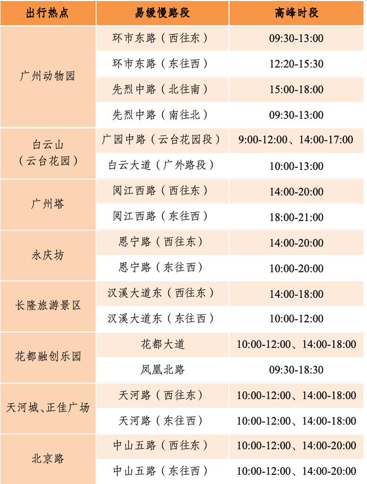 假期首日(5月1日)的9时-18时,还将有一波出行高峰,峰值点预计出现在12时。其间北环高速(沙贝立交—广清收费站、广清收费站—广北桥、广花—白云隧道)、机场高速(三元里—平沙立交)、北三环二期(新和—杨荷立交、朱村东—雷公山隧道路段)、广河高速(春岗立交—八斗立交、中新立交—二龙路段)、华南快速(龙洞收费站—春岗立交)、增从高速(桃园—卫东立交)、东二环高速(笔村立交—火村立交)、广深高速(萝岗—火村)、东南西环高速(仑头—新洲、三滘—东沙路段)、广台高速(金山湖站—大夫山)、南二环高速(鱼窝头互通—张松互通)、莞佛高速(坦尾立交—虎门大桥)、广澳高速(横沥桥—坦尾立交)等瓶颈路段易出现车多排队通行的情况。