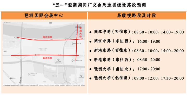 假期期间,市内整体交通运行良好,路网运行主要处于“基本畅通”至“轻度拥堵”状态。市民出行以休闲娱乐、观光购物等为主,出行热点为正佳广场、北京路等核心商圈及广州塔、动物园、白云山、永庆坊、长隆旅游度假区、花都融创乐园等景点,出行高峰集中在10时-12时、14时-18时,其间商圈、景点周边道路或有局部车流缓慢。此外,假期适逢第139届广交会(第三期),展会客流、车流与假期出行客流相互交织,预计琶洲展馆周边的阅江中路、新港东路、琶洲大桥等车流量较大。