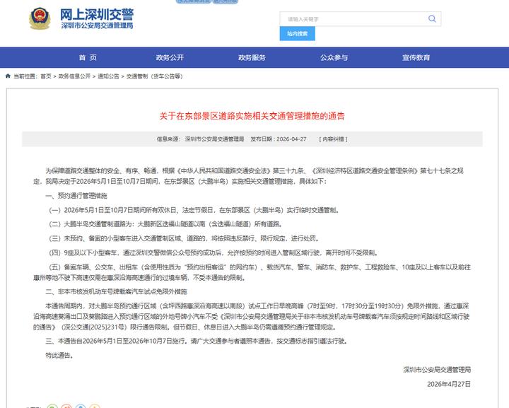 4月27日,深圳交警发布《关于在东部景区道路实施相关交通管理措施的通告》,5月1日至10月7日期间,所有双休日、法定节假日,东部景区(大鹏半岛)实行临时交通管制,管制期间实施预约通行。