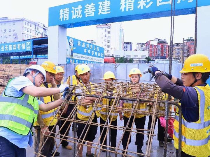 “绑扎间距要均匀,箍筋角度要准确……”在广州元岗项目现场,羊城建筑工匠尹喜元正以“点单式”技能培训,组织一场钢筋绑扎技能比武,加强产业工人职业技能素质提升。