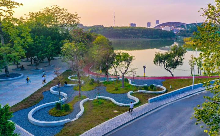广州大学城生态碧道则是一个集碧水清流的生态廊道、亲近自然的共享廊道以及水陆联动的发展廊道于一体的碧道系统,完美平衡了生态构建与休憩空间之间的关系。