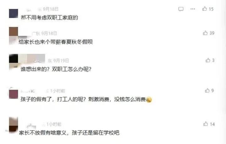 江苏省则在最新文件中提出“企业带薪休假配套”措施,倡导用人单位对子女放春秋假的职工给予弹性考勤支持。