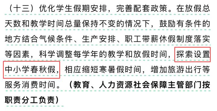 据了解,根据商务部等9部门对外发布的《关于扩大服务消费的若干政策措施》(下称《措施》),共提出五方面19条举措。其中,第十三条指出:优化学生假期安排,完善配套政策。在放假总天数和教学时间总量保持不变的情况下,鼓励有条件的地方结合气候条件、生产安排、职工带薪休假制度落实等因素,科学调整每学年的教学和放假时间,探索设置中小学春秋假,相应缩短寒暑假时间,增加旅游出行等服务消费时间。